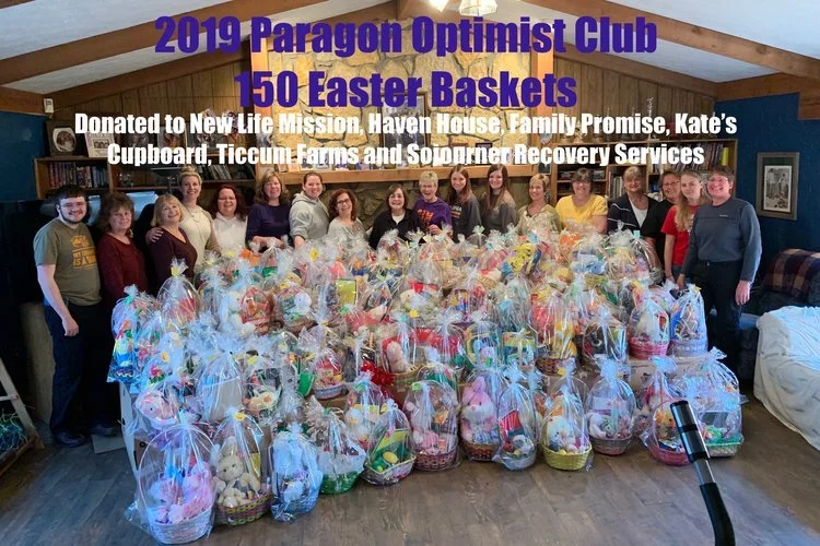 Paragon Optimist Club puts together and delivers over 150 baskets for charities every year. This year the baskets were donated to:Family Promise (10), Haven House (20), Kate’s Cupboard (54), New Life Mission (30), Sojourner Recovery Center (29), Tikkun Farm (36).