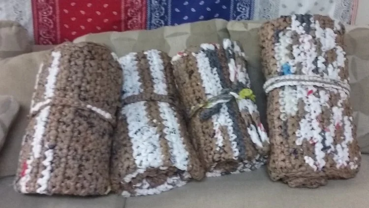 During one of our meetings I stated what my friend was doing and asked if everyone would save plastic bags. Not only did folks say they’d save bags, but they loved the idea and wanted to help make mats too! In July 2018 my friend came to a meeting and taught us how to cut the bag into strips, loop the strips together to make plarn (plastic-yarn). From there she showed us how to take the plarn and crochet it into a sleeping mat. This is all very simple, but can be a long process, which is why many do this at home while watching tv.